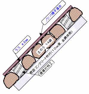 そこで、コンクリートに削孔して地山と連結をつくり48パターンの生育基盤の実験をしたところ、土のうで生育基盤をつくり、その上からノシバ種子を混入した厚層吹き付け資材を混入したもの(図1)の生育が良好でした。