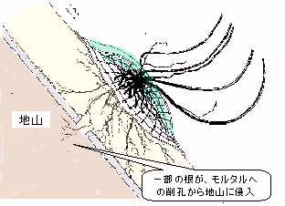 施工後2夏を経過した平成8年9月に実施した根系調査では、ユキヤナギの根系が十分な伸長を示し、一部の根(φ3o程度)がコンクリートへの削孔から地山に侵入しているのが確認されました。(図2)