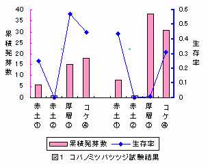表 1の4種の播種区(各区は15p×25p)から構成されるプロットを、ヒノキ林内と林外のそれぞれに、各3プロット設定し、1998年4月に、コバノミツバツツジとモチツツジの種子(試験地内で前年に結実した種子を室温乾燥保存したもの。発芽率80%以上確認済)を各区100粒づつ播種し、約10日に一度観察記録を行いました。